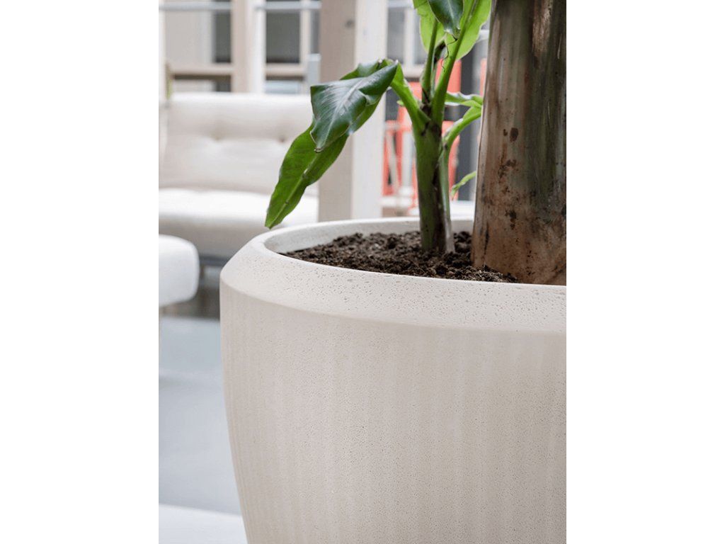 Kvetináč Baq zo zbierky Polystone je vyrobený z polykameňa, zmesi syntetického a mletého vápenca. Tento materiál má rovnaké vizuálne vlastnosti ako prírodný kameň, ale vyniká svojou prekvapivo nízkou hmotnosťou. Kvetináč má rebrovanú konštrukciu a matný povrch, čo mu dodáva moderný vzhľad. Tento produkt je vhodný iba na použitie v interiéri.