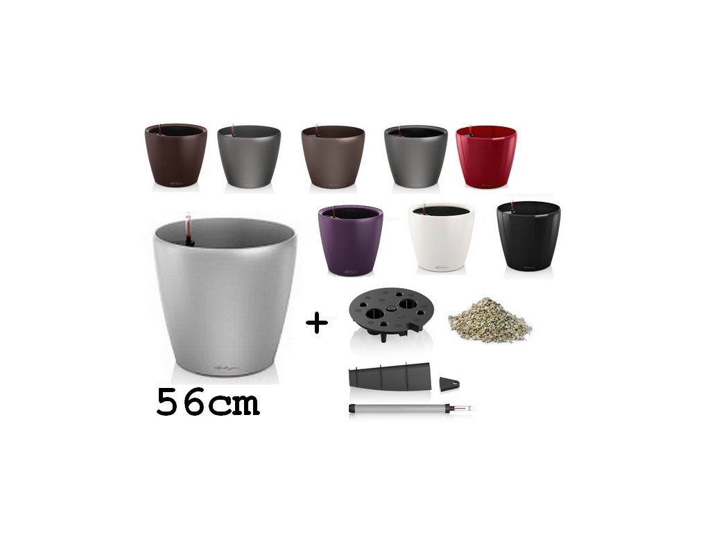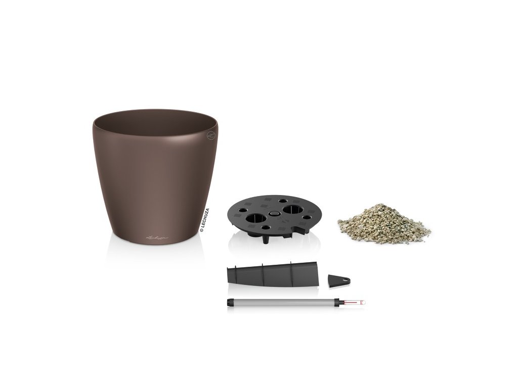 Samozavlažovací květináč Lechuza Classico 60 patří mezi velké květináče klasického nízkého tvaru s kulatým profilem. K dispozici v řadě lesklých a matných odstínů. Vzhledem k tomu, že má zabudovaný přepad a vypouštěcí ventil, je možné jej použít jak v interiéru, tak ve venkovním prostředí. Komplet obsahuje květináč a samozavlažovací set zahrnující separační desku, která odděluje zeminu od zásobníku vody, plnící šachtu na vodu, měrku vody a sáček Lechuza PON na drenážní vrstvu.