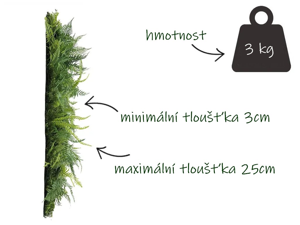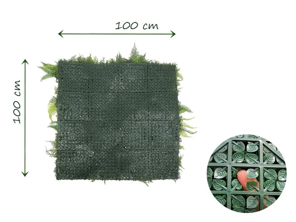 Dielce sú opatrené klipy pre ľahké spájanie dielcov do veľkých plôch. Dekoratívne časť plotu tvorí hustá skupina realisticky vyrobených listov, ktoré sú vsadené do plastového rastru. Rozloženie listov je pohľadovo jednostranné, druhá strana je tvorená plastovou mriežkou.
