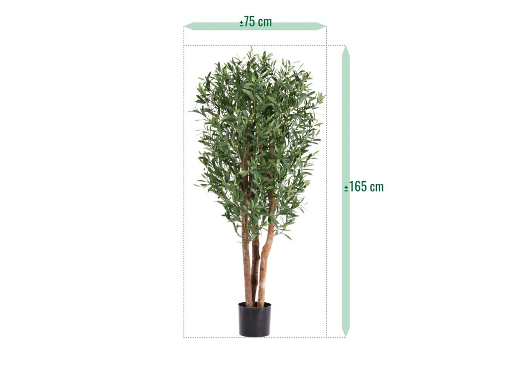 Veľmi atraktívny olivovník s plodmi, vysoký 165 cm. Šírka koruny približne 70 cm. Upevnený v plastovom kvetináči s rozmermi 20 x 18 cm. Vhodný na vonkajšie použitie.