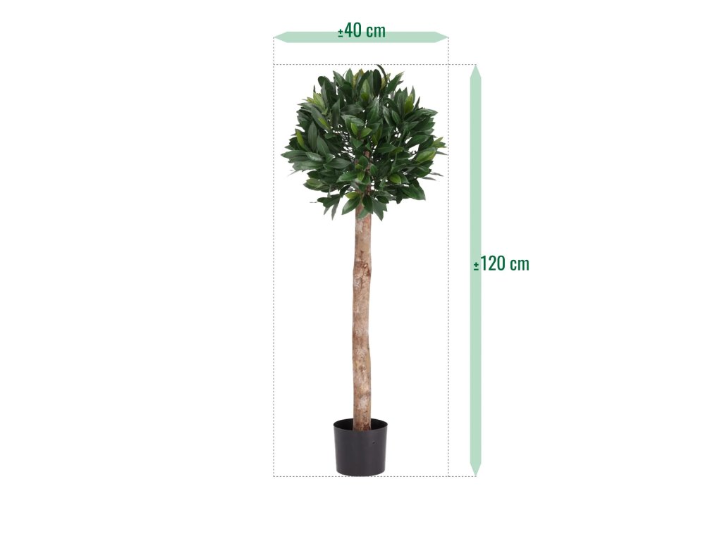 Umelý guľatý vavrín na prírodnej stonke. Výška 120 cm, priemer gule 40 cm. Vhodný na vonkajšie použitie vďaka materiálu chránenému proti UV žiareniu.