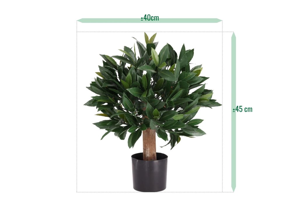 Umelý guľatý vavrín na prírodnej stonke. Výška 45 cm, priemer gule 40 cm. Vhodný na vonkajšie použitie vďaka materiálu chránenému proti UV žiareniu.