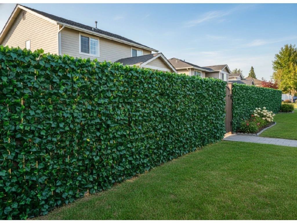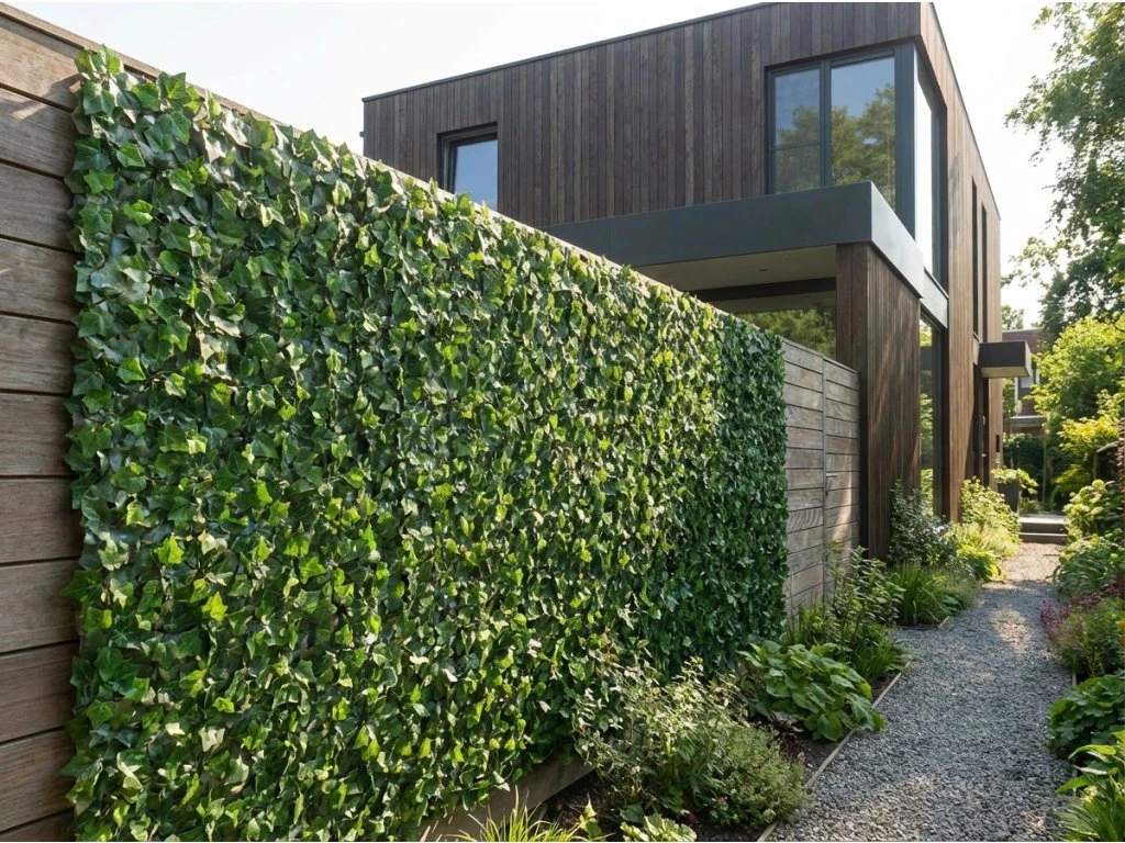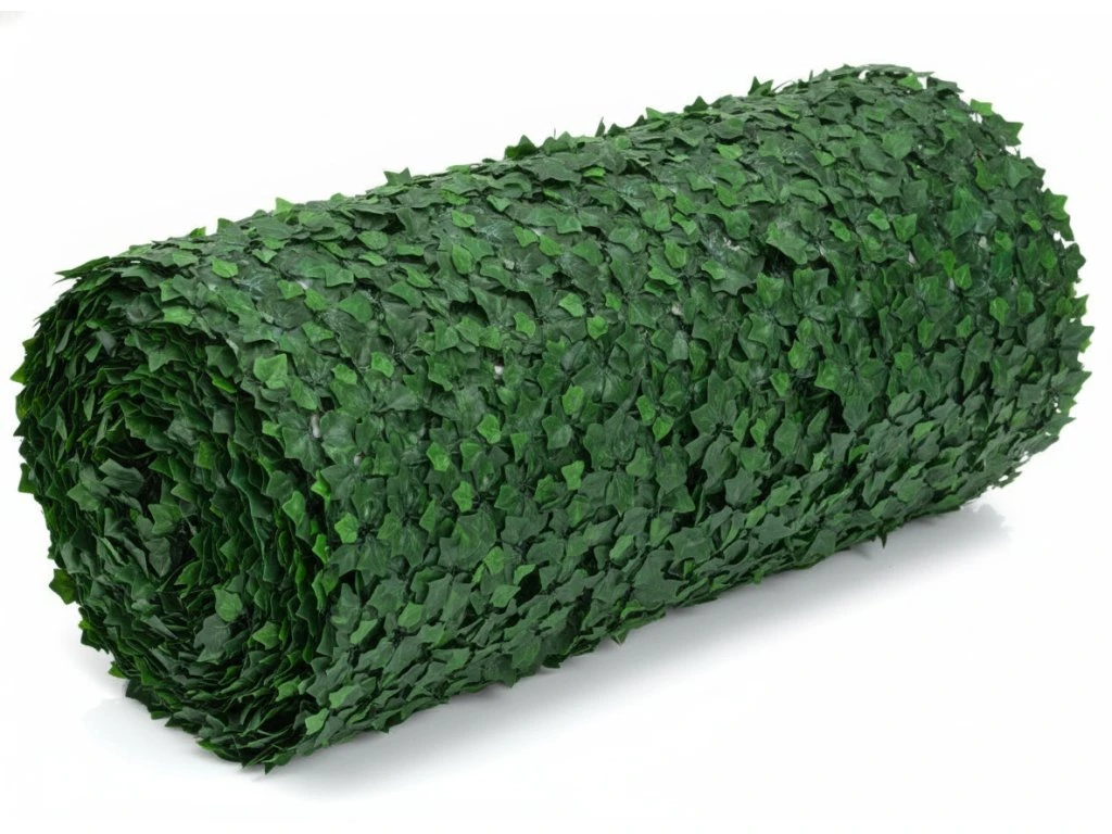 Kvalitný umelý živý plot z brečtanových listov na flexibilnej plastovej mriežke.